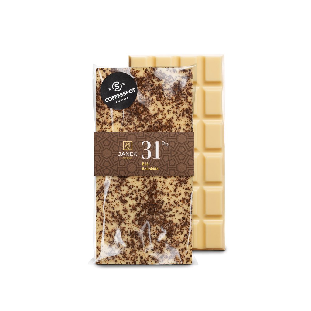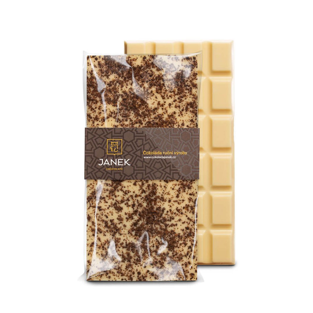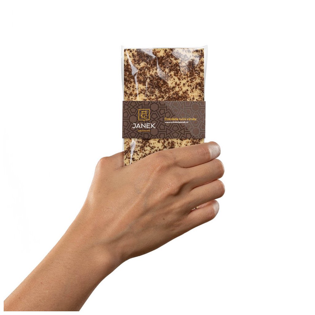 Sladká bílá čokoláda provoněná vanilkou. Žádnými aromaty nebo esencemi. Ale zrníčky pravé vanilky. K tomu přidejte pár nadrcených zrn kávy Ethiopia Limu Gr.2 a máte tabulku, která voní, křupe a zároveň se pomalu rozplyne na jazyku.