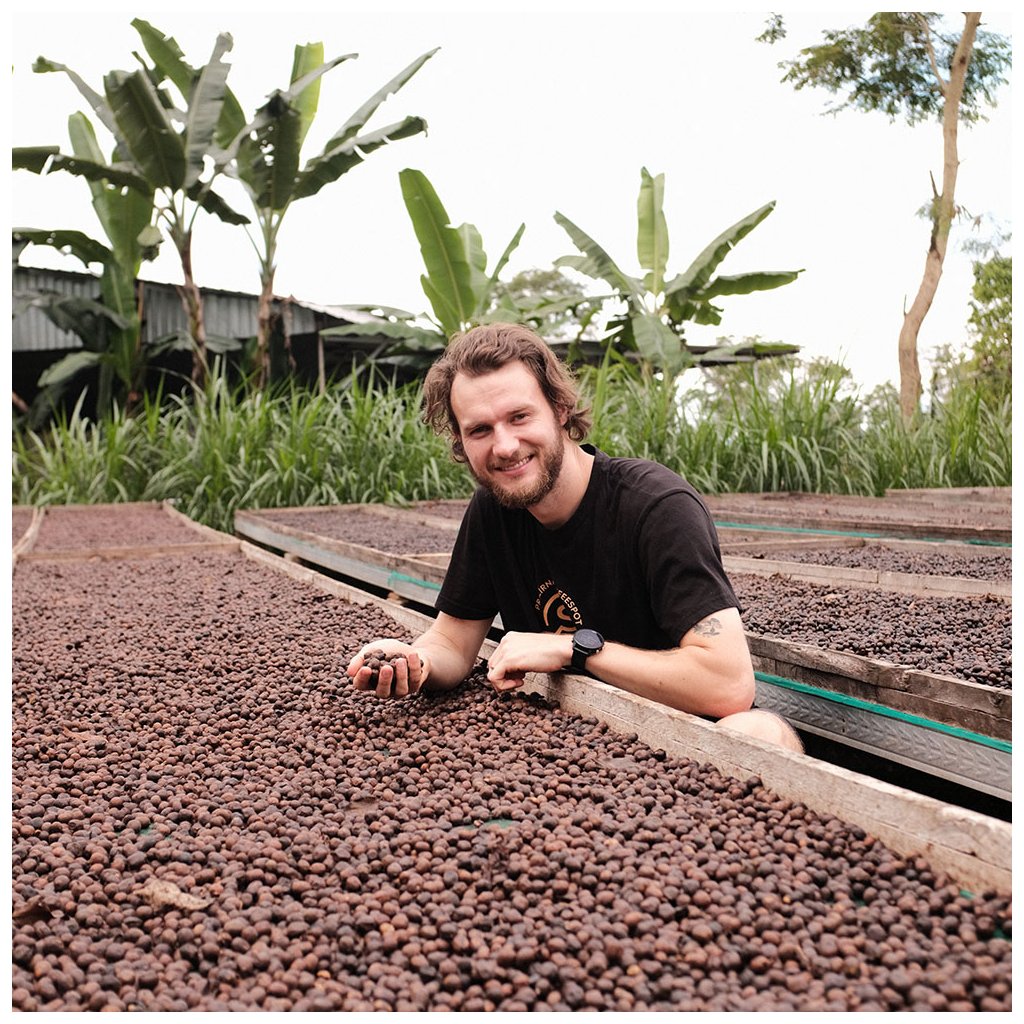 V květnu 2025 se náš tým, konkrétně náš pražič Michal, vydal na další cestu do Indonésie. Během návštěvy ostrovů Jáva a Sumatra se přímo v originu seznámil s pěstováním, zpracováním i místními farmáři – a právě zde osobně vybral i tuto kávu. Rozhodli jsme se koupit rovnou celý kontejner. Kávu jsme objednávali v červnu, ale až 29. 12. 2025 dorazil kontejner do našeho skladu.