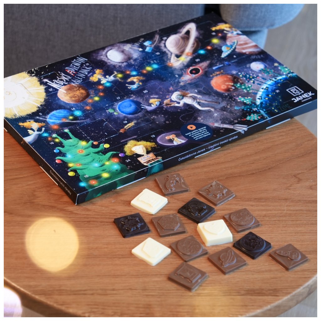 V tomto kalendáři naleznete rovnou 25 políček s vesmírně dobrou čokoládou (tmavou, mléčnou i bílou). V kalendáři naleznete na čokoládě různé tvary a obrázky, které souvisí s nebem a vesmírem, které propojí vánoční čas a zároveň toto vesmírně kouzelné místo.